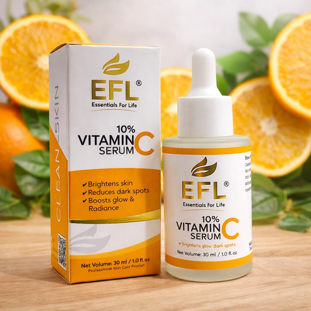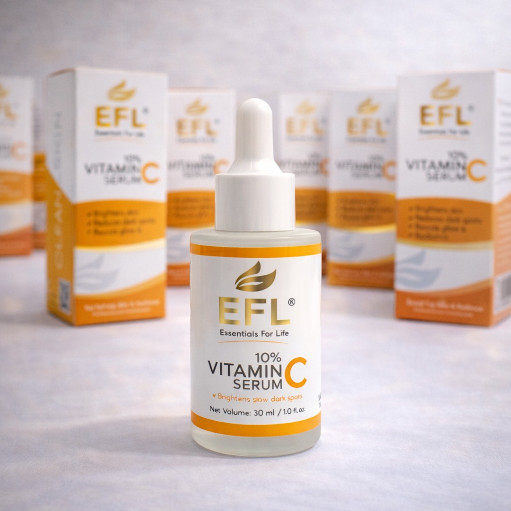 EFL Vitamin C Serum (10%) helps brighten skin, reduce pigmentation, fade dark spots, and improve texture. Lightweight formula for daily use on all skin types.